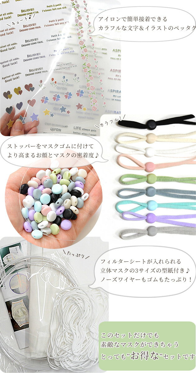 ※上画像の完成マスクは出来上がりの商品です↓単品はこちら↓立体マスクキット フィルターシートつきマスクゴム調整ストッパー ミックスペッタグ 全64デザイン【商品詳細】■商品番号0515■セット内容・立体型マスクキット【0451】ダブルガーゼ 無地 綿100% 幅約150×98cmマスクゴム【0443】約10y(約9m)ノーズワイヤー【0444】 樹脂高機能フィルターマスクシート キット専用サイズ:約22×60cmレシピ、型紙(息がしやすいよう新しいレシピが追加しました)・ときめくペッタグ64デザイン【0485】・マスクゴム調整ストッパーミックス全9色【4407】■ゆうパケット1点まで可■必要なもの・ミシン・縫い針・マチ針・縫い糸・はさみ・筆記用具・・チャコペーパー・ルレット・アイロン、ゴム通し など■商用利用完成した作品の販売は可能ですが、キットの転売及び、レシピ&型紙をコピーしたり、販売をすることは固く禁止致します。